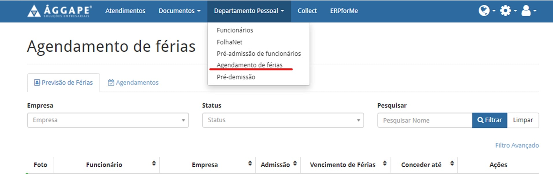 Solicite e acompanhe a programação de férias em 'Departamento Pessoal', 'Agendamento de Férias'. O cumprimento do prazo legal de concessão é muito importante para evitar pagamentos em dobro e multas administrativas.
