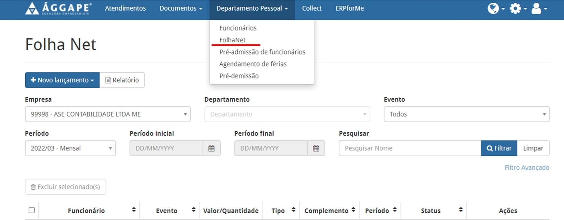 Acesse 'Departamento Pessoal', 'FolhaNet', para lançar variáveis, como faltas, horas extras e gratificações.