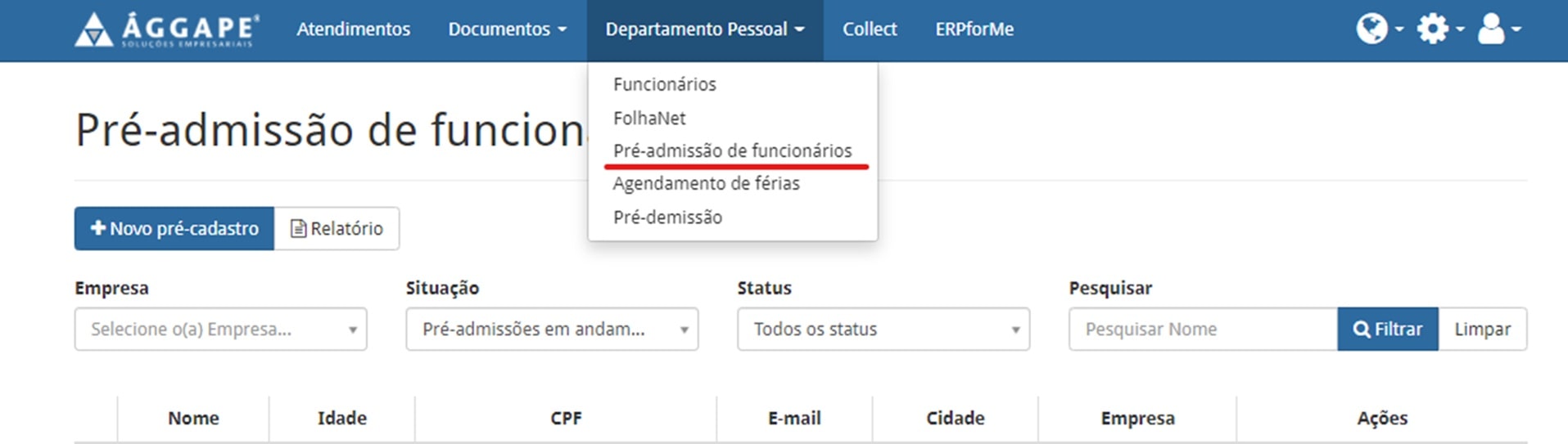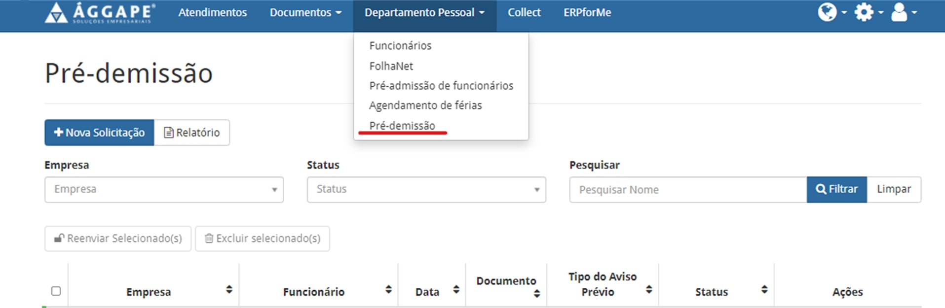 Para solicitar a demissão, acesse 'Departamento Pessoal', 'Pré-demissão' e clique em Nova Solicitação