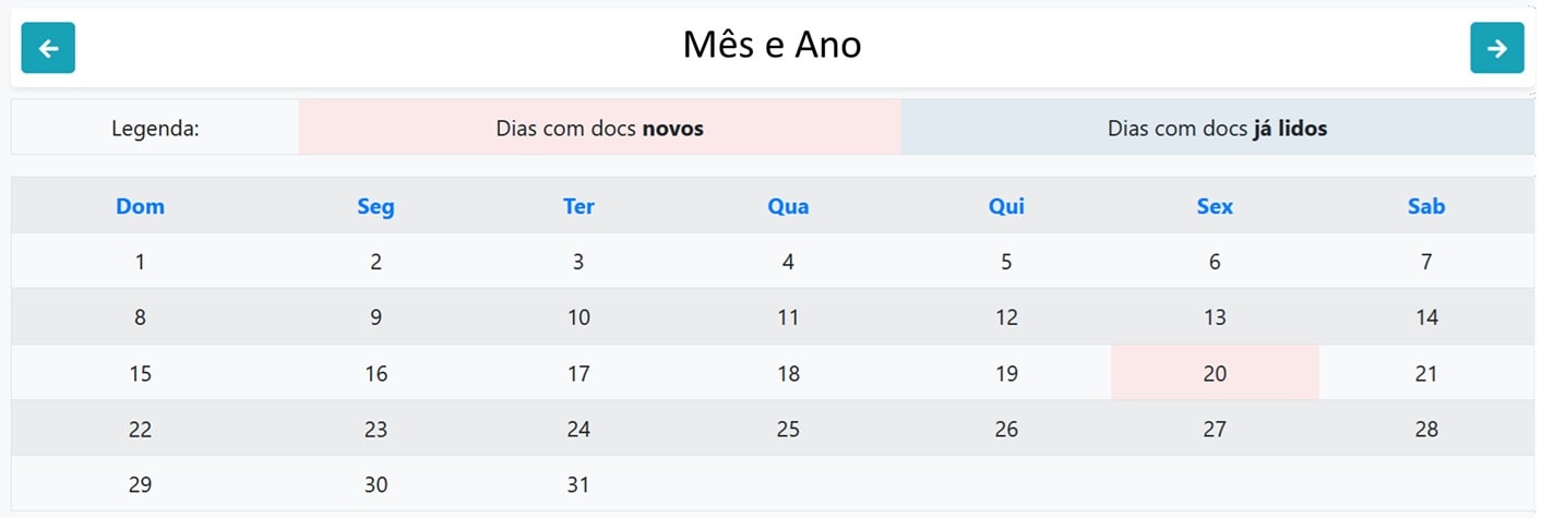 No calendário veja a legenda com as cores. Clique no dia destacado para visualizar os documentos e nas setas para alterar o mês.